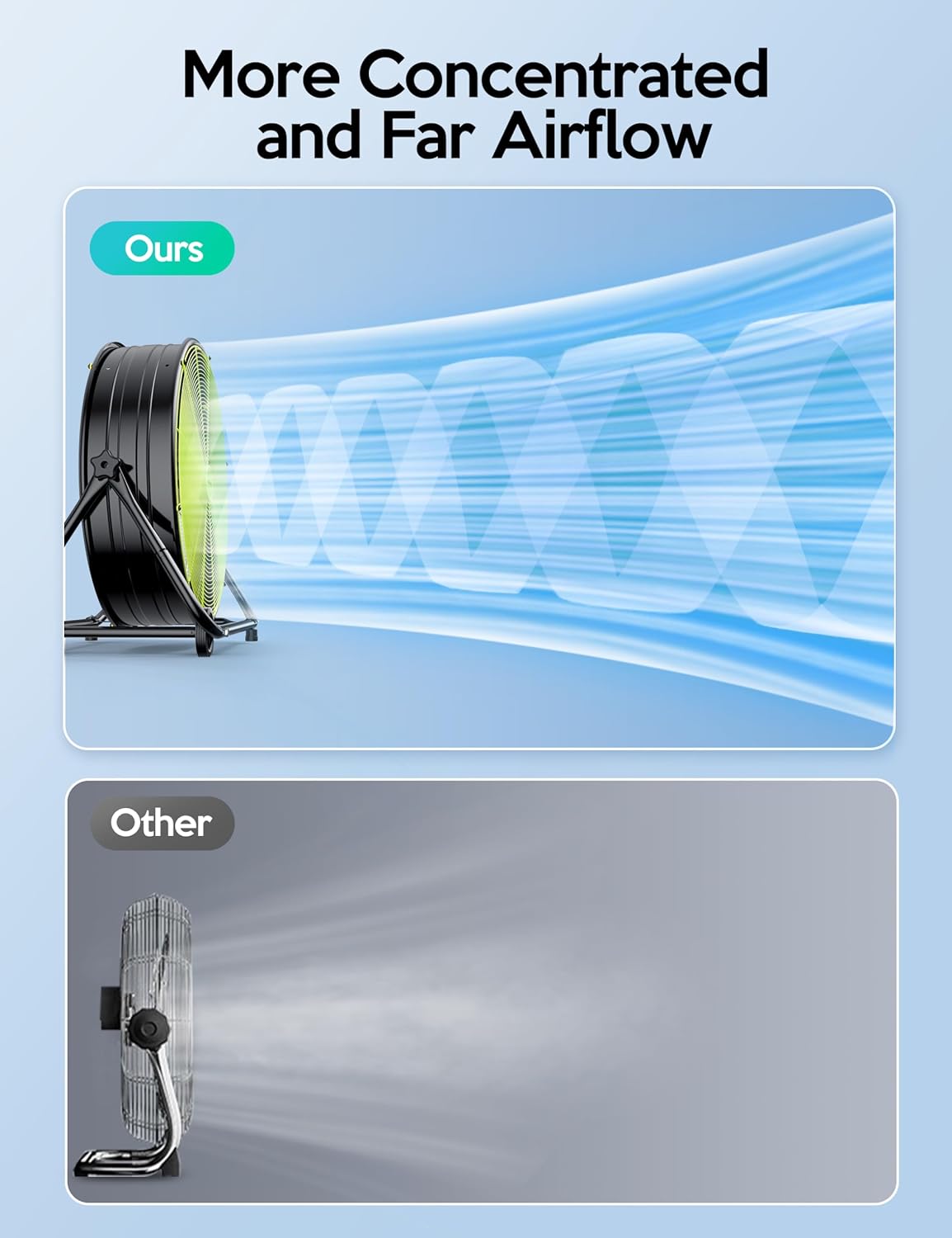 Movilidad: Junto con las ruedas de su base, las asas laterales y un cable de alimentación de 6 pies, este ventilador industrial es increíblemente móvil y fácil de trasladar de un lugar a otro, tanto en interiores como en exteriores.