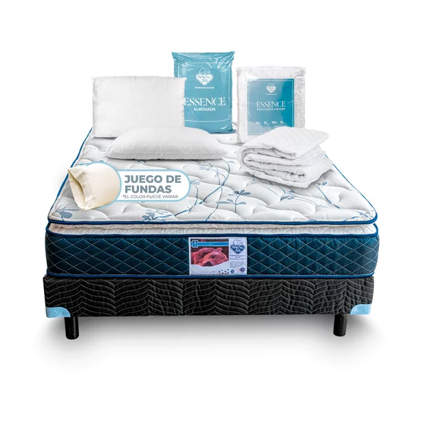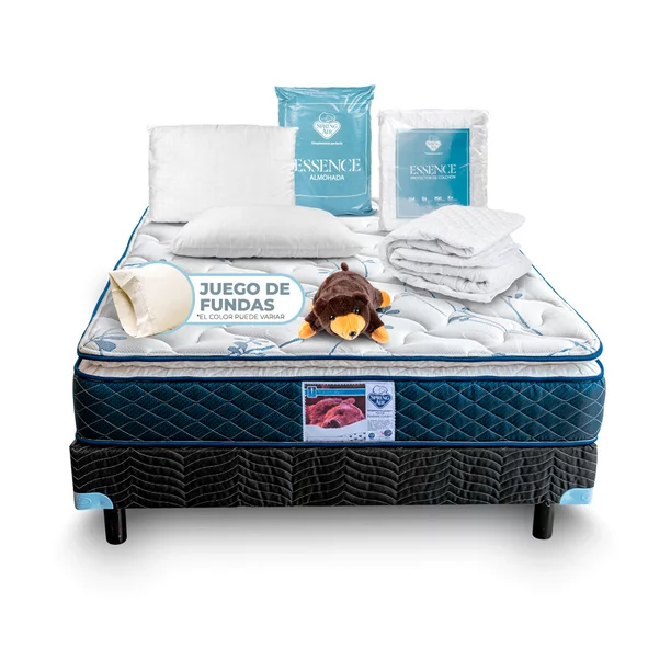 1 colchón matrimonial + 1 box matrimonial + 2 almohadas Spring Air + 1 Cubre Colchón de Felpa Impermeable + 1 par de fundas de almohada + 1 Osito Spring Air