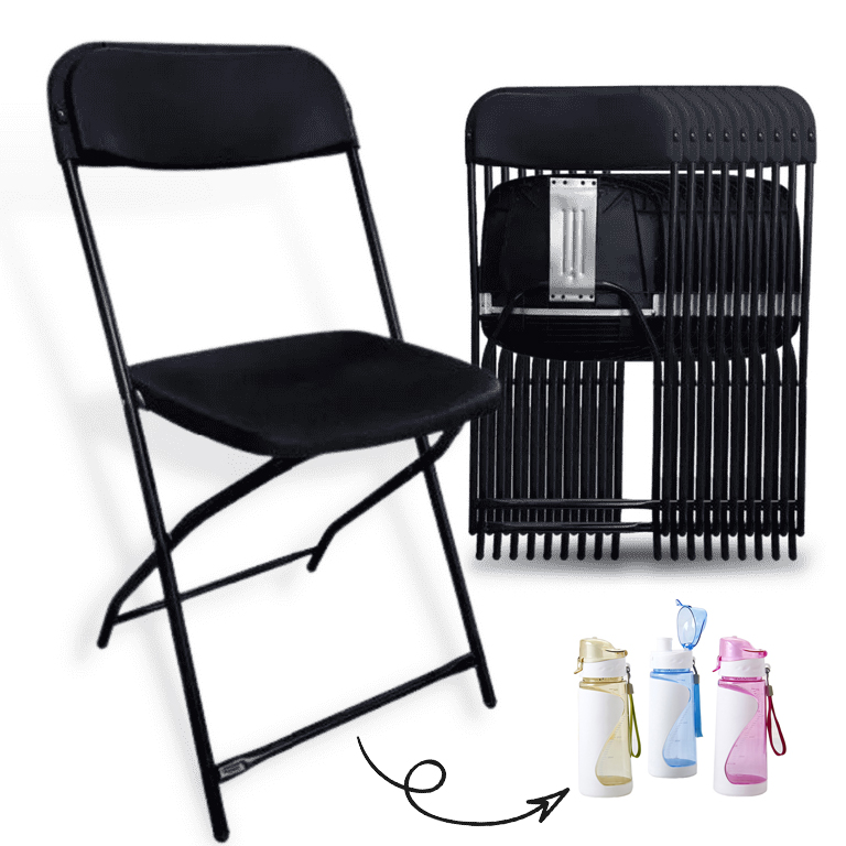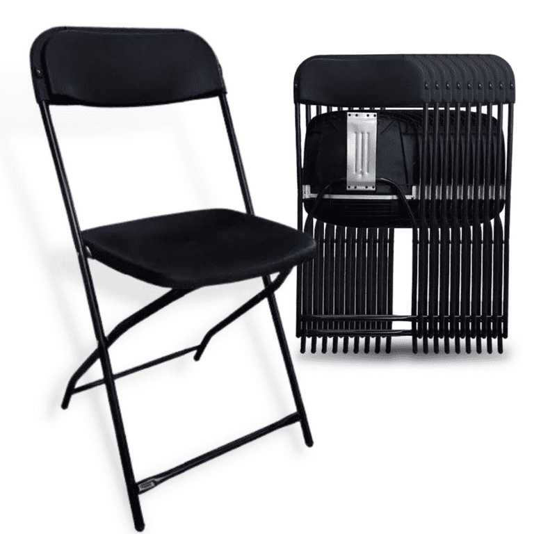 - Paquete (set) compuesto por 10 sillas plegables de plástico color negro con asiente reforzado de calibre 18. Ideal para sus necesidades, eventos, jardines y fiestas de exterior.